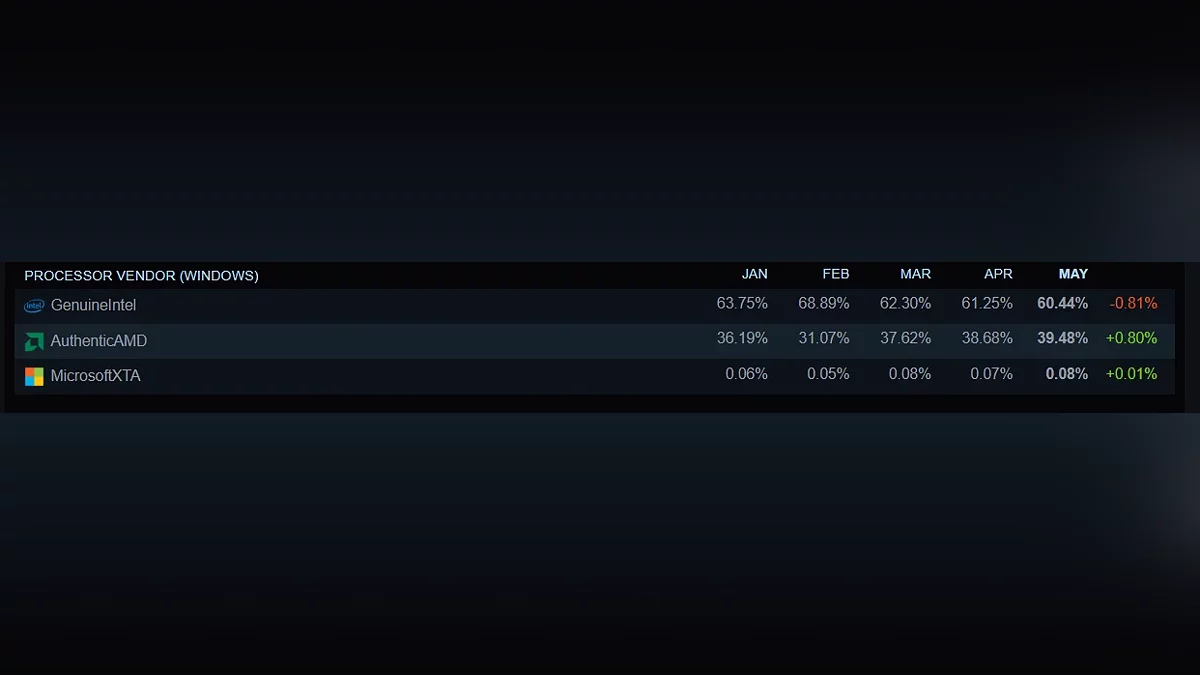 На ринку процесорів ситуація майже не змінилася. Intel впевнено утримує лідерство (60,44%). Частка AMD у травні зросла на 0,80% і склала 39,48%.
