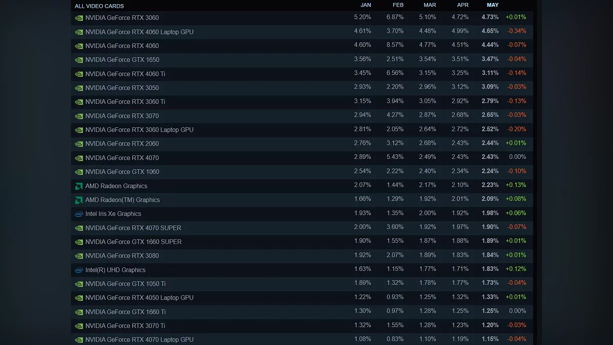Серед відеокарт на перше місце в травні вийшла NVIDIA RTX 3060 (4,73%). Наступними йдуть RTX 4060 Laptop (4,65%), десктопна RTX 4060 (4,44%), GTX 1650 (3,47%) і RTX 4060 Ti (3,11%).