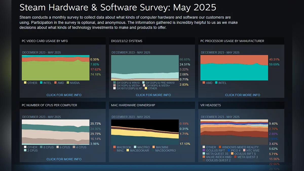 Valve опублікувала підсумки травневого опитування в Steam. Як зазвичай, він демонструє інформацію про найвикористовуваніші відеокарти, процесори, мови, операційні системи і не тільки.
