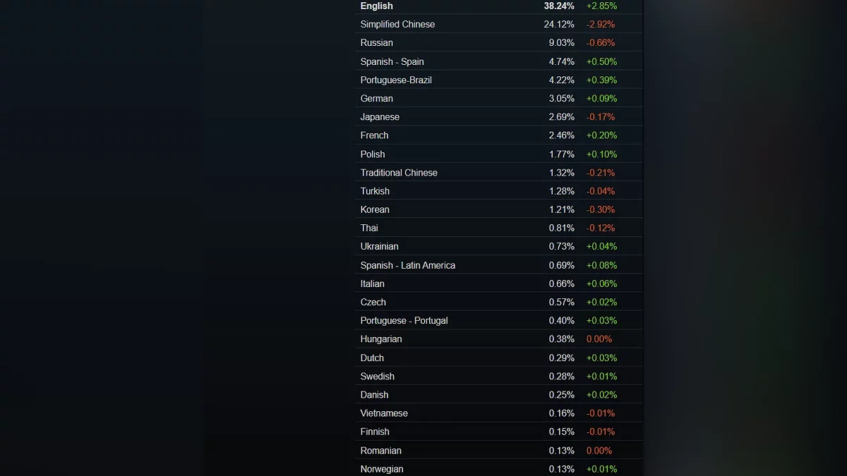 Що стосується мов, частка англійської зросла в травні на 2,85% і склала 38,24%. На другому місці спрощена китайська (24,12%), а на третьому — російська (9,03%).