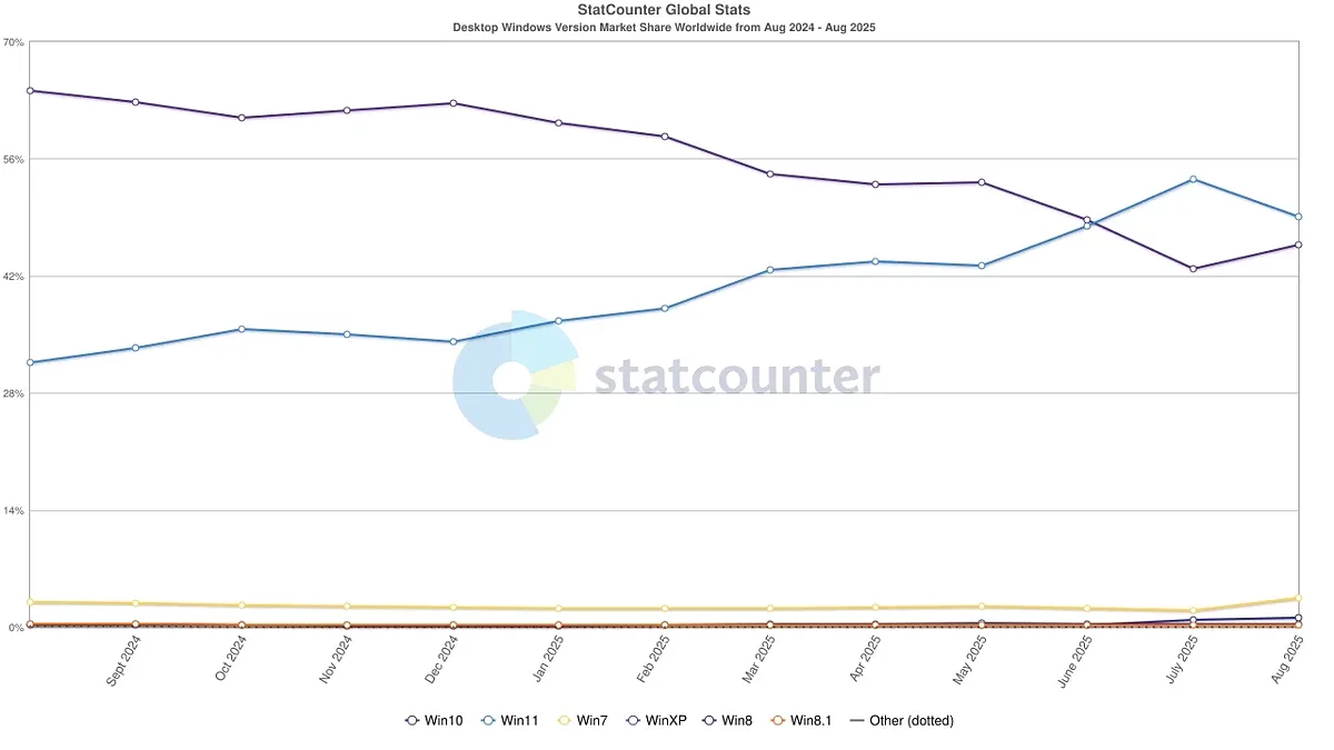 Согласно последним данным агентства Statcounter, операційна система Windows 11 вперше за довгий час продемонструвала зниження частки популярності, що не заважає їй по-прежньому обходити Windows 10 за кількістю користувачів. Станом на початок вересня 2025 року на Windows 11 припадало 49,02% усіх ПК з Windows, що на 4,5 процентних пункти менше, ніж у попередньому місяці.