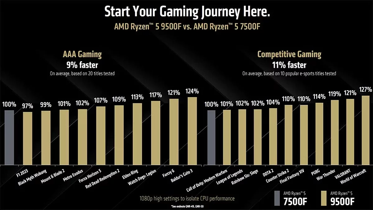 Ключовою особливістю Ryzen 5 9500F, як і у попередньої моделі 7500F, стало відсутність інтегрованого графічного ядра, такий підхід дозволяє знизити вартість чипа. Згідно з даними AMD, новинка демонструє відчутний приріст продуктивності в іграх у порівнянні з попередником. В залежності від конкретного проєкту, компанія заявляє про підвищення частоти кадрів на 7-24%, так найбільший приріст помічений у Counter-Strike 2 та Baldur's Gate 3. В середньому ж, за запевненнями AMD, приріст в AAA-проєктах становить близько 9%, а в змагальних дисциплінах — 11%.