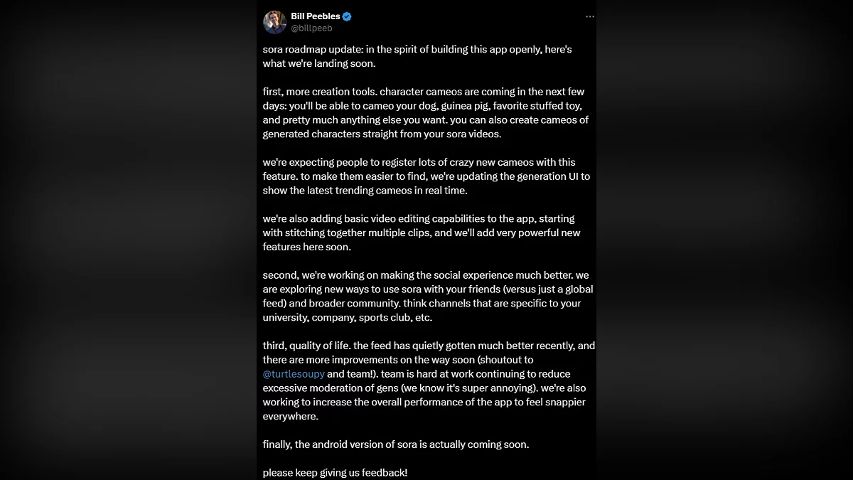 Також команда продовжує роботу над стабільністю і швидкістю роботи Sora. Користувачі вже могли помітити, що стрічка рекомендацій стала розумнішою, а система модерації рідше блокує контент без вагомої причини. Очікується, що ці покращення зроблять використання сервісу ще більш комфортним. Зміни торкнуться і соціальної складової сервісу, в планах — створення вузькоспеціалізованих спільнот.