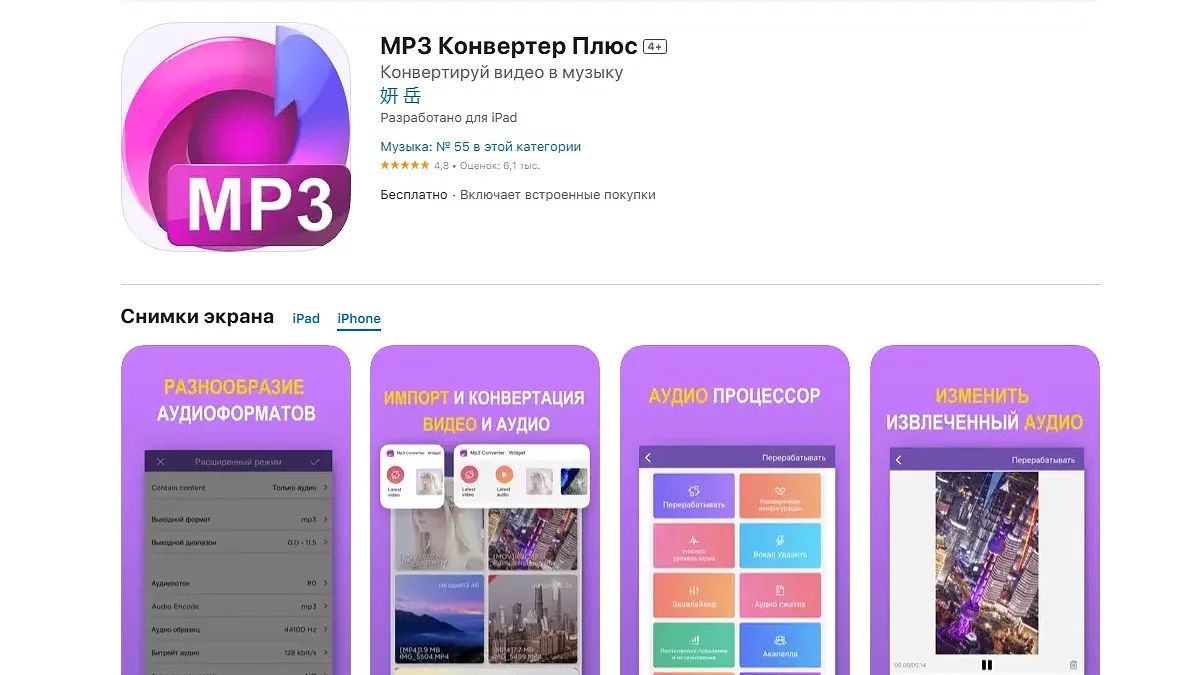 Просте додаток для конвертування аудіофайлів в MP3. Підтримує безліч інших форматів, таких як M4V, MOV, MP4, 3GP та 3GPP, дозволяє вилучати та конвертувати музику з відео, має функцію шумоподавлення та інструменти для постобробки аудіо. Крім того, вилучені треки можна встановити в якості рінгтона.