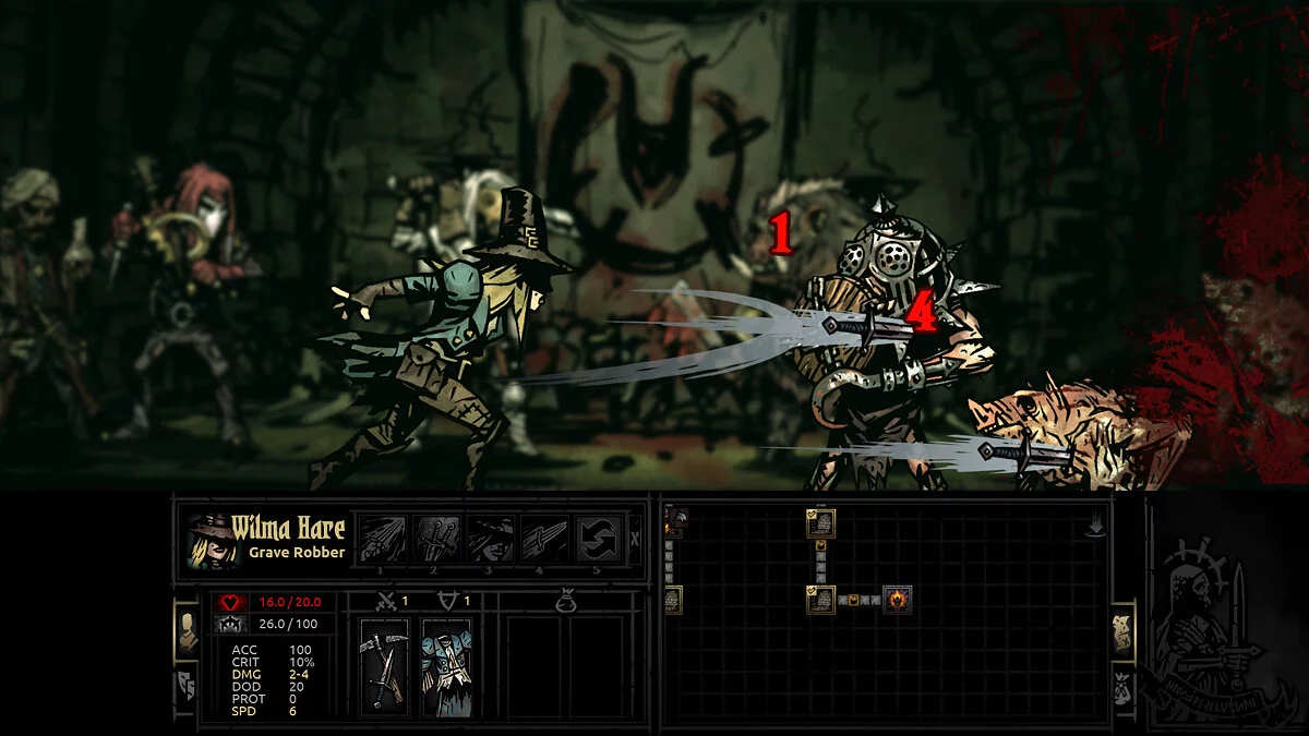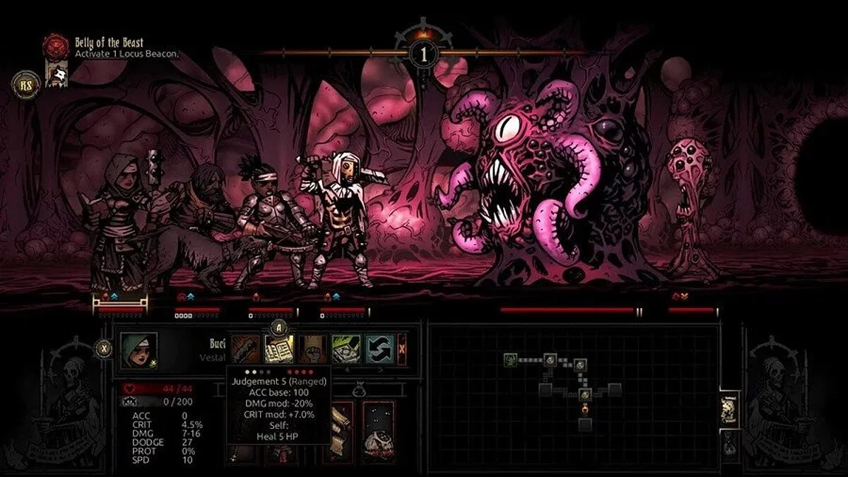 Darkest Dungeon — дуже хардкорна гра. Геймеру потрібно постійно стежити не тільки за рівнем здоров'я персонажів, але й за їх психічним станом. Кожен герой унікальний і володіє здібностями. В ході вивчення підземель вони завжди піддаються стресу, який згубно позначається на їхньому емоційному сприйнятті пригоди. Бойова система виконана в 2D-стилістиці. Окрім правильного підбору героїв і здібностей, гравець повинен враховувати положення персонажів на полі бою.
