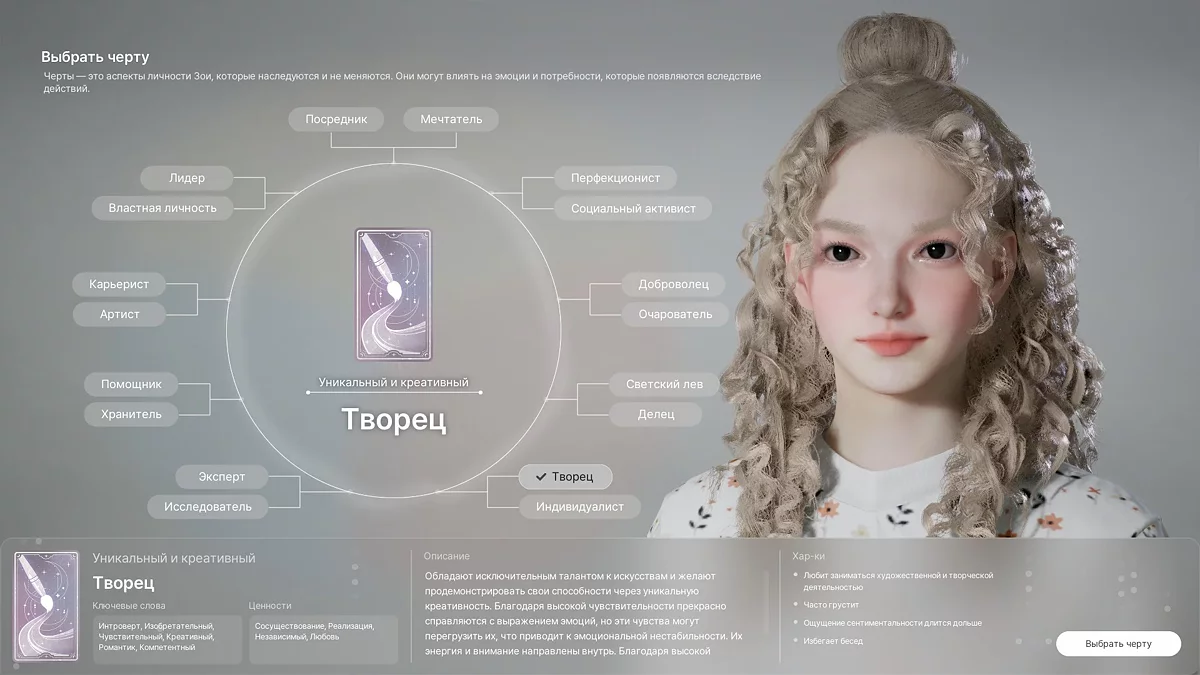 Параметри особистості персонажа задати також можна — вибрати з кількох «типів», яким властиві різні захоплення та риси характеру.