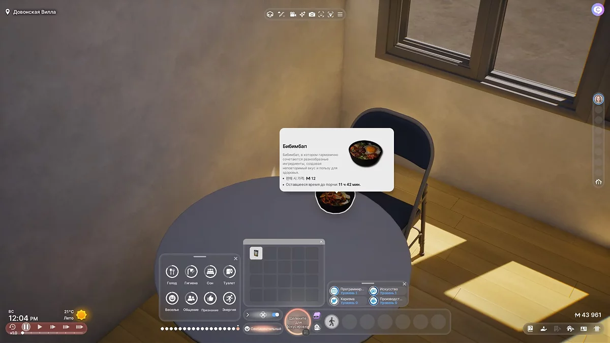 Але от коли вся новизна стає більш-менш звичною — для цього вистачає десь години — кидаєш погляд на годинник. І розумієш, що в ігровому часі і дня не пройшло. Геймплей в inZOI дуже неспішний. Довжина дня за замовчуванням — 1,5 реальних години, і це прямо-таки ні в які ворота. Можна зменшити цей відрізок в налаштуваннях, але навіть так відчуття, що гра занадто повільна, не покидає.