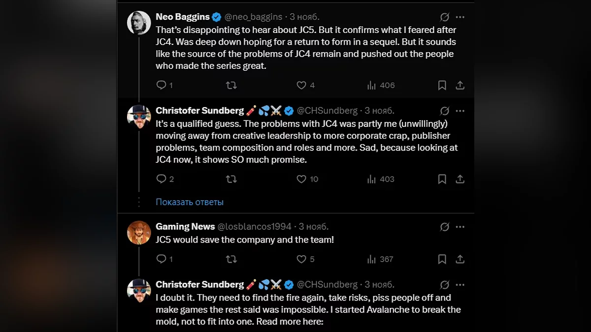 Кристофер Сундберг (Christofer Sundberg), творець франшизи Just Cause та засновник Avalanche Studios, нарешті прокоментував майбутнє популярної серії, заявивши, що Just Cause 5 ніколи не вийде. За його словами, навіть якби розробка продовження і почалася, це не врятувало б студію, оскільки проблеми з четвертою частиною виявилися занадто серйозними.
